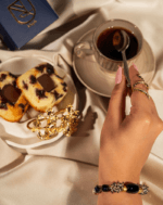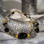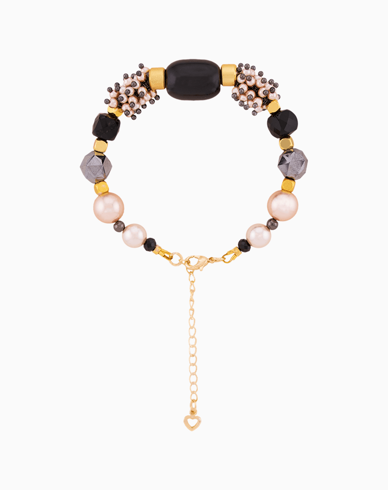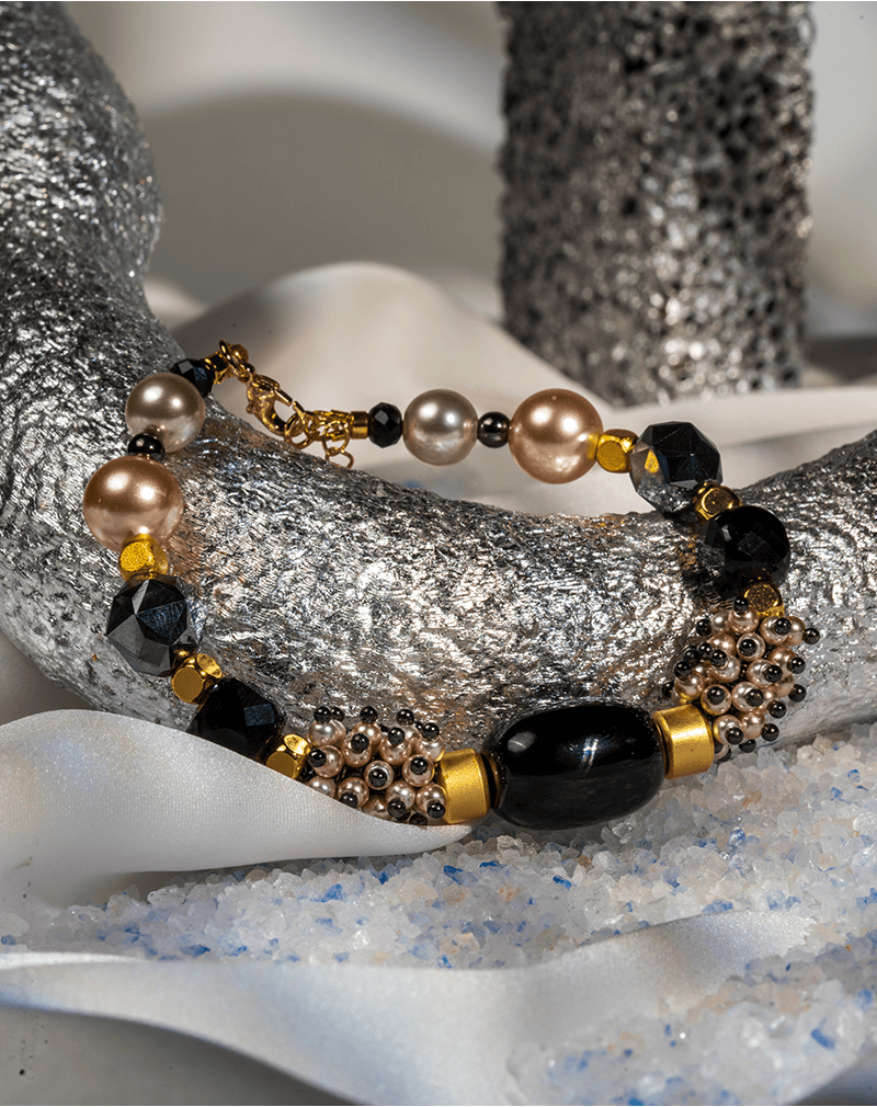 در مرکز آن سنگ حدید طبیعی با درخشش متالیک قرار دارد و اطرافش مرواریدهای صدفی سفید و هلویی، مهرههای طلایی و مشکی ظریف چیده شدهاند.