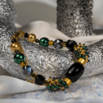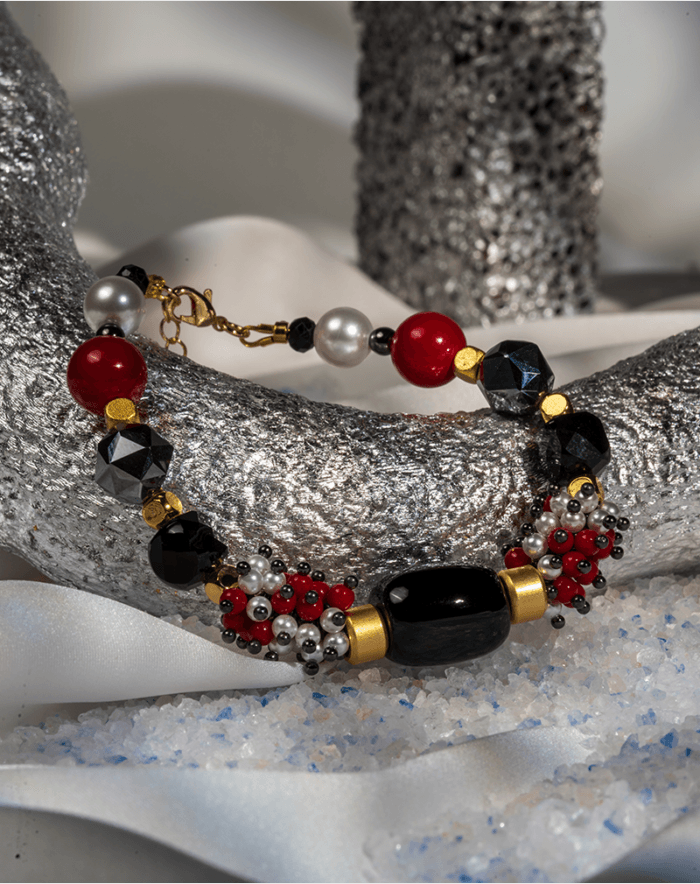 ترکیب سنگ حدید (نماد تمرکز و محافظت)، مرجان قرمز (نماد انرژی و شهامت)، و مروارید (نماد آرامش و وقار)، نمایانگر توازن بین قدرت و لطافت در طراحی زنانه است.