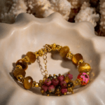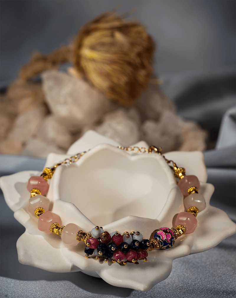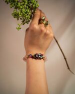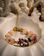 دستبند زنانه شوکا مدل رز کوارتز دست‌ساز، اثری منحصربه‌فرد از ترکیب سنگ‌های رز کوارتز (نماد عشق و آرامش)، گارنت (انرژی و اعتمادبه‌نفس) و اونیکس (حفاظ و تعادل) است. این دستبند با زنجیری از مهره‌های سنگی طبیعی ساخته شده و در مرکز آن ترکیب ریز‌مهره‌های چندرنگ با بافت طلایی جلوه‌ای هنری ایجاد کرده‌اند. مهره لعابی سرمه‌ای با طرح گل، به آن حس کلاسیک شرقی بخشیده است. بخش فلزی با روکش طلایی و قفل خرچنگی قابل تنظیم تکمیل شده است. هر قطعه به‌صورت دست‌ساز و از متریال ضد حساسیت ساخته شده و برای استفاده‌ی روزمره یا هدیه‌ای خاص بسیار مناسب است.