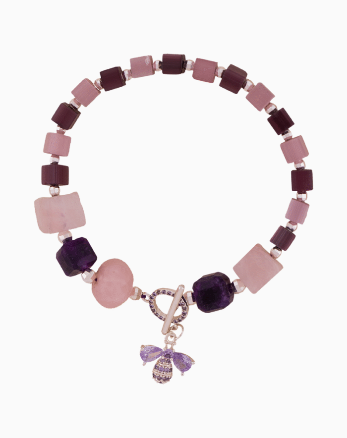 دستبند زنانه شوکا مدل کوارتز صورتی و آمتیست دستساز، ترکیبی لطیف و هنری از سنگهای صورتی و بنفش همراه با آویز زنبور نگیندار است.