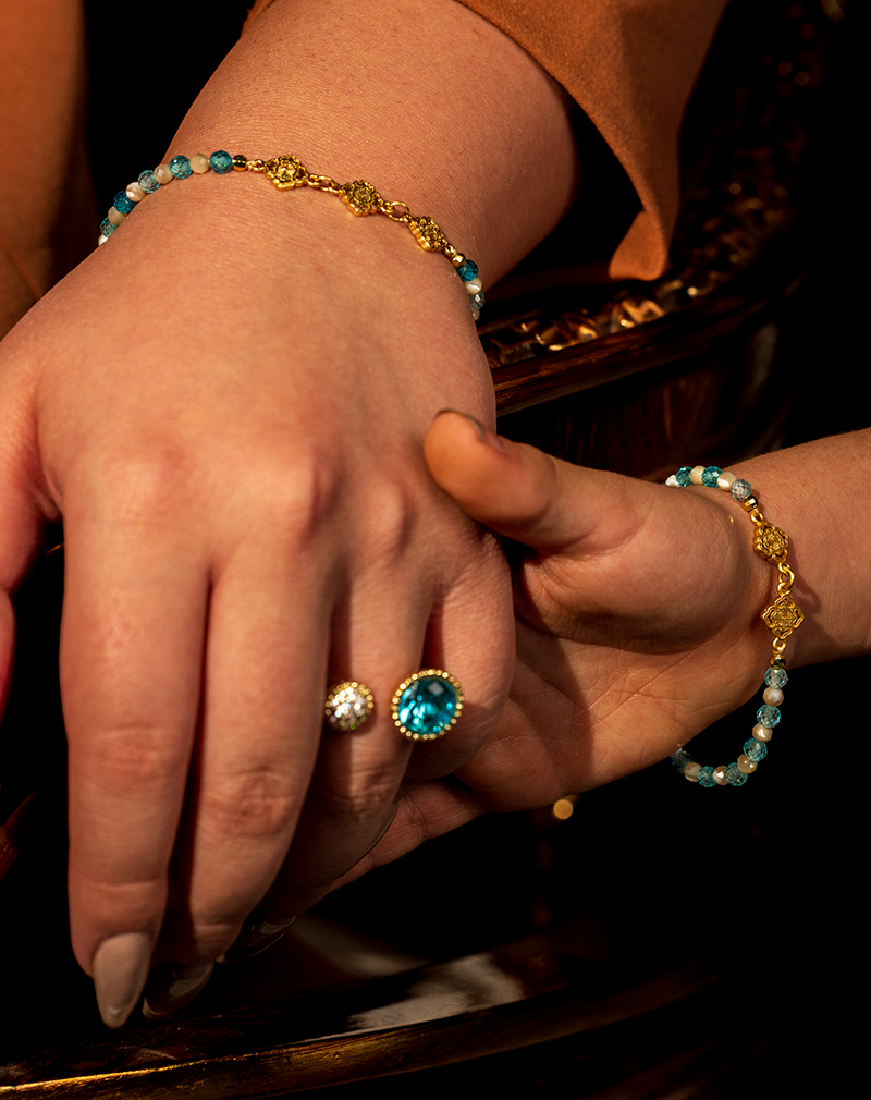 فاصلهدهندهها و جزئیات طلایی ظریف در میان مهرهها جلوهای لوکس و درخشان به دستبند بخشیده و باعث شده این اکسسوری با انواع استایلهای کلاسیک، مینیمال و تابستانی هماهنگ شود.