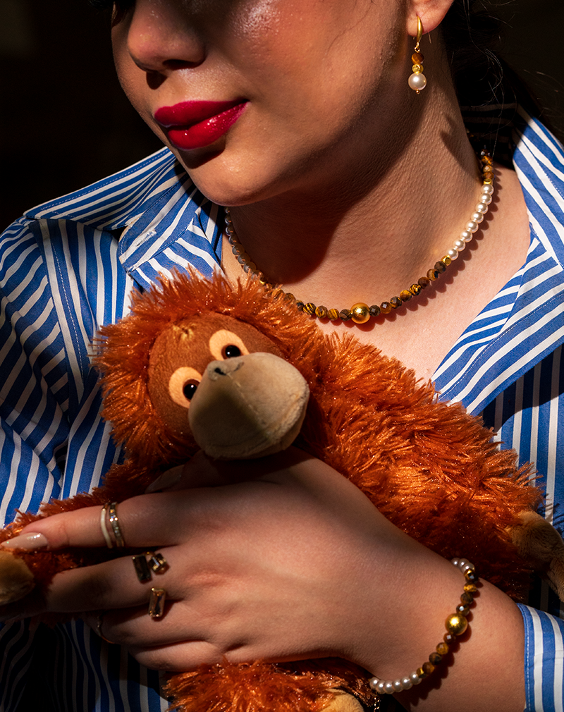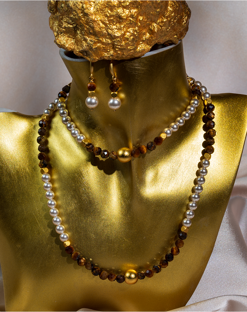 ست چشم ببر و مروارید طلایی شوکا ترکیبی زیبا از سنگ طبیعی چشم ببر با رنگ قهوهای گرم و درخشش خاص، در کنار مرواریدهای سفید براق است که جلوهای کلاسیک و لوکس به این مجموعه داده است.
