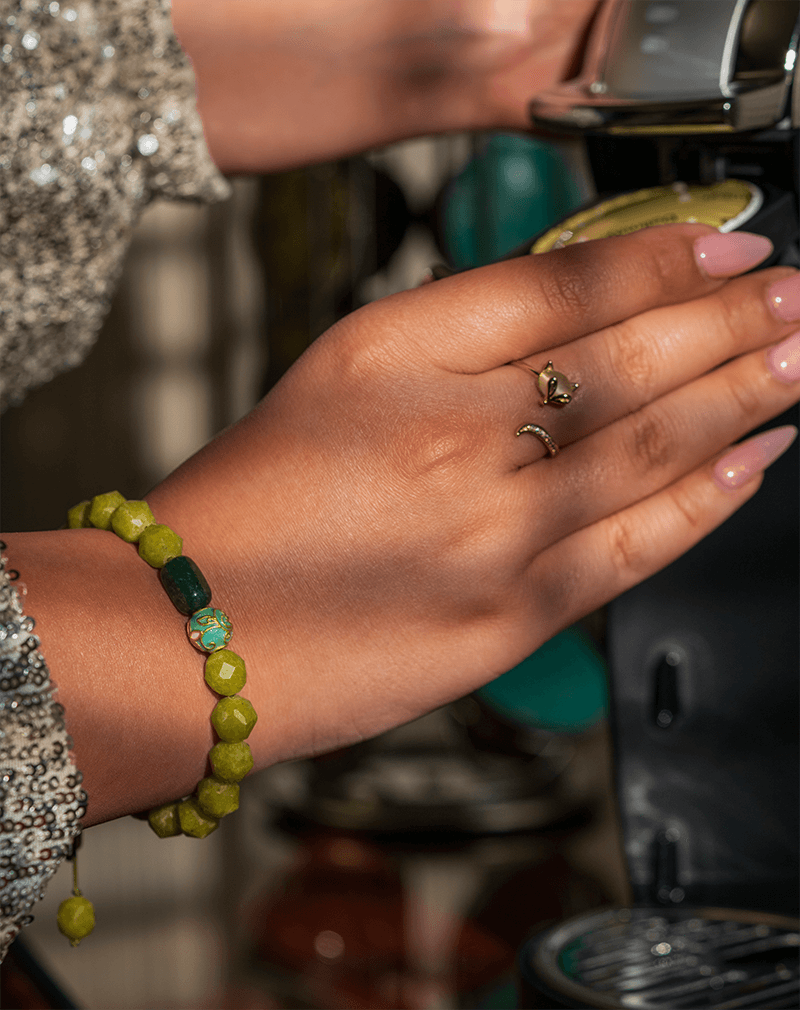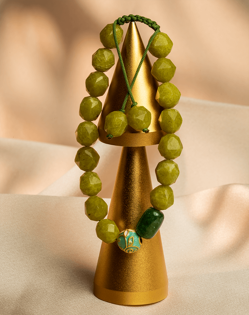 این دستبند زنانه مهره‌ای با طراحی پیچیده و الهام‌گرفته از طبیعت، ترکیبی چشم‌نواز از مهره‌های چندوجهی سبز رنگ و یک مهره تزئینی فیروزه‌ای با نقش طلایی است. استفاده از بند نخ سبز همراه با گره‌کاری دستی، حس اصالت و دست‌ساز بودن را به وضوح نشان می‌دهد.