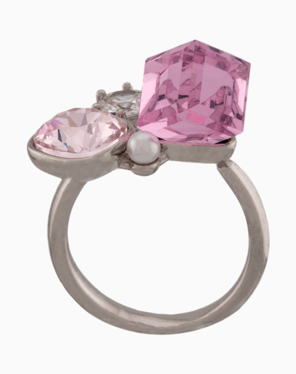 انگشتر مدل “روزالیا” از برند شوکا، یک قطعه هنری با چیدمان نامتقارن از کریستالهای صورتی در دو تناژ مختلف، نگین درخشان و یک مروارید ظریف است. این انگشتر با پایه نقرهای رنگ و طراحی قابل تنظیم، جلوهای شیک و منحصربهفرد به استایل شما میبخشد.